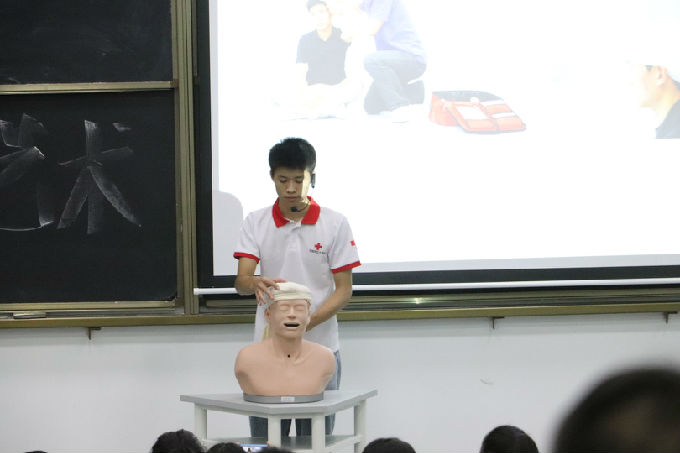 主持人说明了活动的整个流程,本次活动分为两个部分,一是成人心肺复苏术,二是头顶部右侧大出血和左前臂中段闭合性骨折的包扎,由来自急救协会的12位主讲人进行讲解。