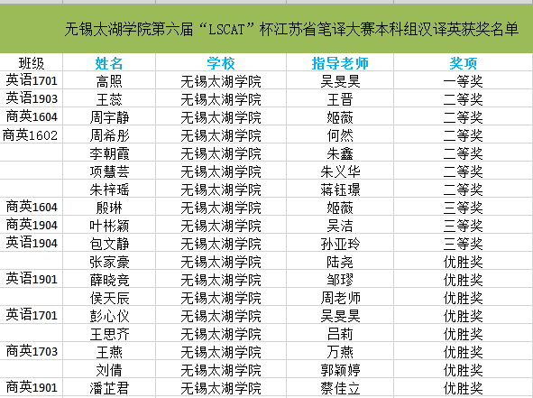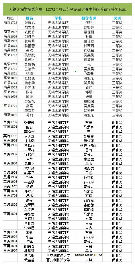 ——外国语学院第六届“LSCAT杯”江苏省笔译大赛获奖名单