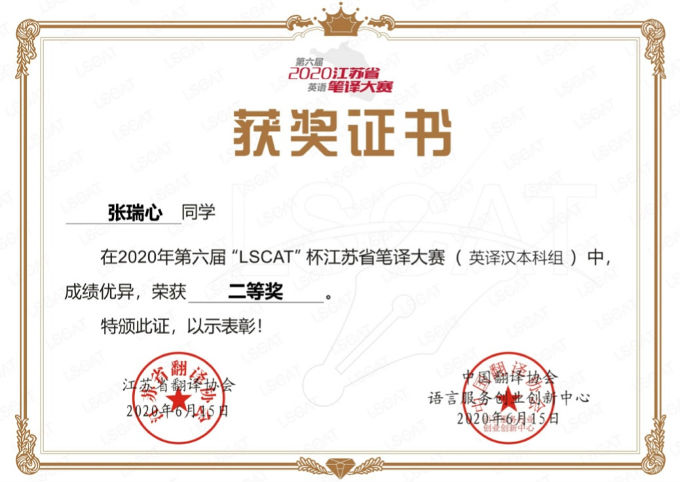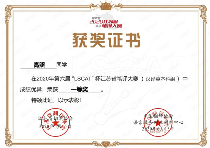 据悉,“LSCAT杯”江苏省笔译大赛(英语)由中国翻译协会语言服务行业创业创新(LSCAT)中心、江苏省翻译协会、江苏省高校外语教学研究会联合举办,旨在满足我省日益扩大的对外交流需求,推动高校英语教学整体发展,促进专业学科建设,对培养和提升高素质翻译人才发挥了积极作用。