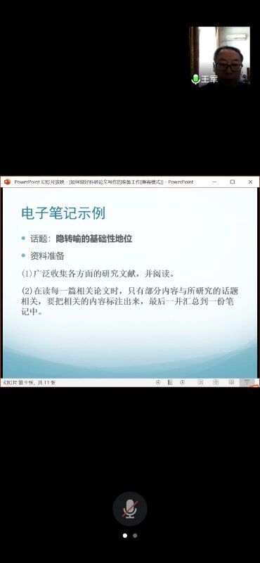 王军教授讲座生动易懂接地气,以“如何博览群书、查找写作资料、确定专题研究、电子笔记制作、提炼细节提纲”五方面展开,介绍了阅读与论文写作的密切关系。王教授以自身的科研论文实战经验,提炼出实用高效的笔记法则,务实创新、指导性强,得到了在线听讲教师的一致好评。最后,王军教授与外国语学院黄旭等青年教师做了互动交流,答疑解惑,为青年教师指明方向。上海外语教育出版社对本次讲座给予了大力支持。