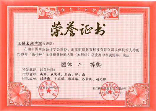 2019年“衡信杯”全国税务技能大赛总决赛于11月13—15日在浙江杭州成功举办。大赛由中国商业会计学会主办,由“衡信教育科技有限公司”提供技术支持。经过海选赛、预选赛的层层选拔,来自全国各地的140支代表队420名选手进入决赛环节。在指导老师高岩、成晓婧、王晶、邹小磊的精心指导下,由高岩、成晓婧老师带队、5名同学(郑琼慧、刘泽豪、卜亚刚、苏紫茵、赵文静)组成的无锡太湖学院代表队不负重望,最终以优异成绩获得本科组团体二等奖,为学校和学院争得了荣誉。