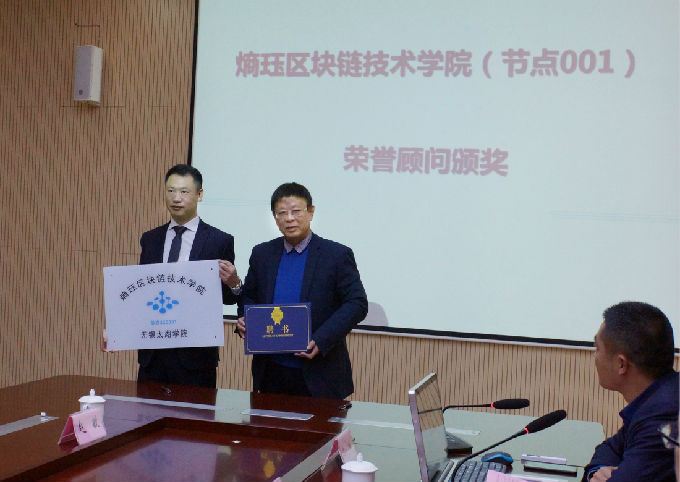 本次揭牌仪式研究中心、省级重点实验室还聘请了三位企业高管或首席科学家,以及区块链专家作为该中心的高级研究员,今后我们会聘请更多的专家加盟。与此同时研究中心还与校企合作单位进行合作签约,并授牌,合作单位有:无锡优级先科信息技术有限公司、浙江智兴信息科技有限公司、无锡壹佳环球科技有限公司、无锡食物链互联网信息服务有限公司、无锡泛太科技有限公司、无锡锡冲驰软件科技有限公司。优级先科总经理孙钰介绍了熵珏区块链技术学院,并授予无锡太湖学院为熵珏区块链技术学院(节点001),并授牌,同时还颁发了荣誉顾问证书。见图3。