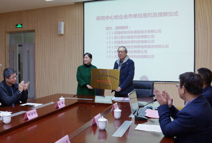 为积极响应习总书记号召,加快推动学院对区块链技术和产业的创新发展,走在区块链发展的前端。无锡太湖学院及江苏省物联网应用技术重点建设实验室联合无锡优级先科信息技术有限公司、无锡壹佳环球科技有限公司、浙江智兴信息科技有限公司、无锡泛太科技有限公司、无锡冲驰软件科技有限公司、无锡食物链互联网信息服务有限公司等区块链技术方和项目方企业,于2019年12月4日在无锡太湖学院联合成立“区块链技术研发与应用研究中心”。学校领导和相关学院的领导和老师参加了研究中心的揭牌仪式。见图1。