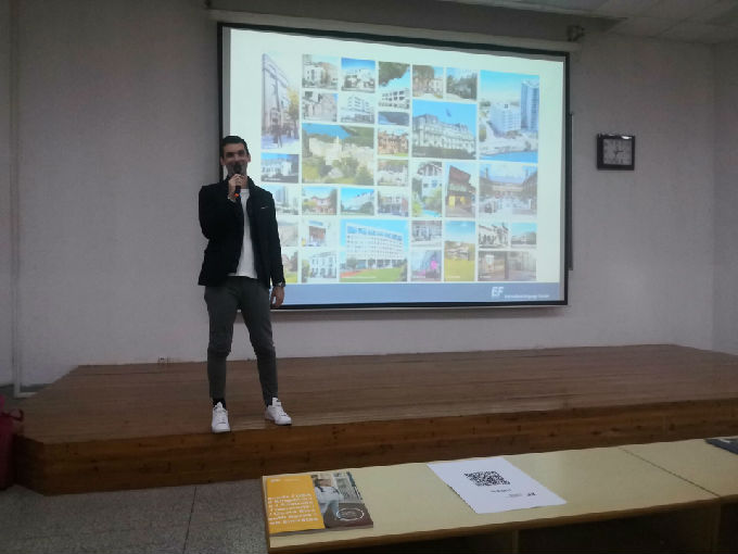 最后,由欢举出实例又再次点明营造语言环境的重要性。有一个同学通过英孚留学,仅仅20周的时间,他的雅思成绩就有了从5.5到7.0的巨大突破。而欢自身仅学习了三个月的中文,便可上台与我们做简单的交流。