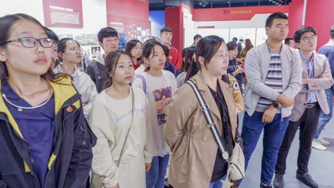 整个展厅由“太湖明珠·锡城岁月”“强富美高·奋力领跑”“璀璨无锡·各领风骚”三个篇章,以图片文字、数字对比、沙盘模型、动画视频、互动体验等多种形式全方位、多层次地集中呈现无锡70年来经济社会发展取得的巨大变化。展览长廊以时间为刻度,仿佛一条时光隧道,穿行其中,波澜壮阔的历史画卷在眼前徐徐展开。大家在解说员的带领下驻足仔细观看、仔细聆听,感受无锡从一个市域印证中华民族从站起来、富起来,到强起来的伟大飞跃。
