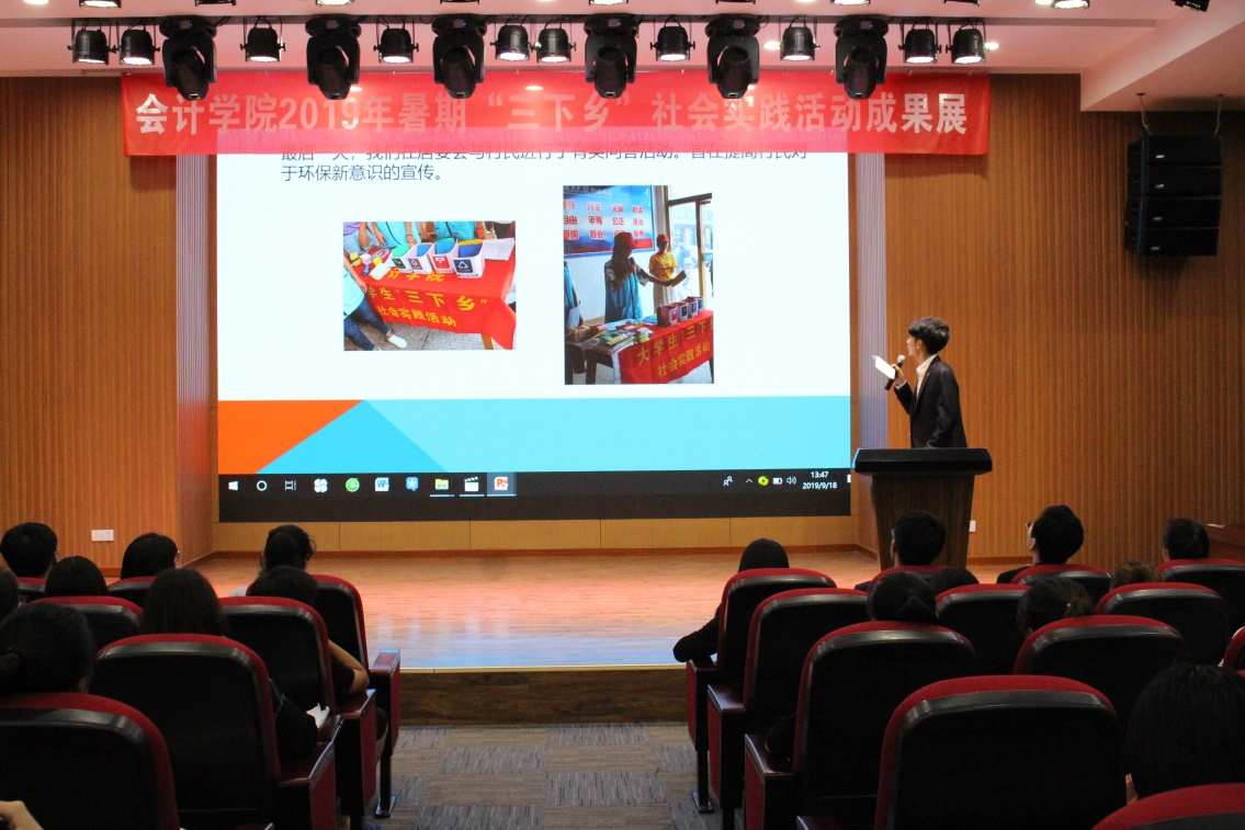 为深入贯彻党的十九大精神,培育和践行社会主义核心价值观,引导与帮助广大青年学生在社会实践中受教育、长才干、做贡献,争做“六有”大学生。会计学院团总支于9月18日13:30在大学生活动中心A举办会计学院2019年暑期“三下乡”社会实践活动成果展。经过选拔,最终共有十二支队伍入选优秀团队。