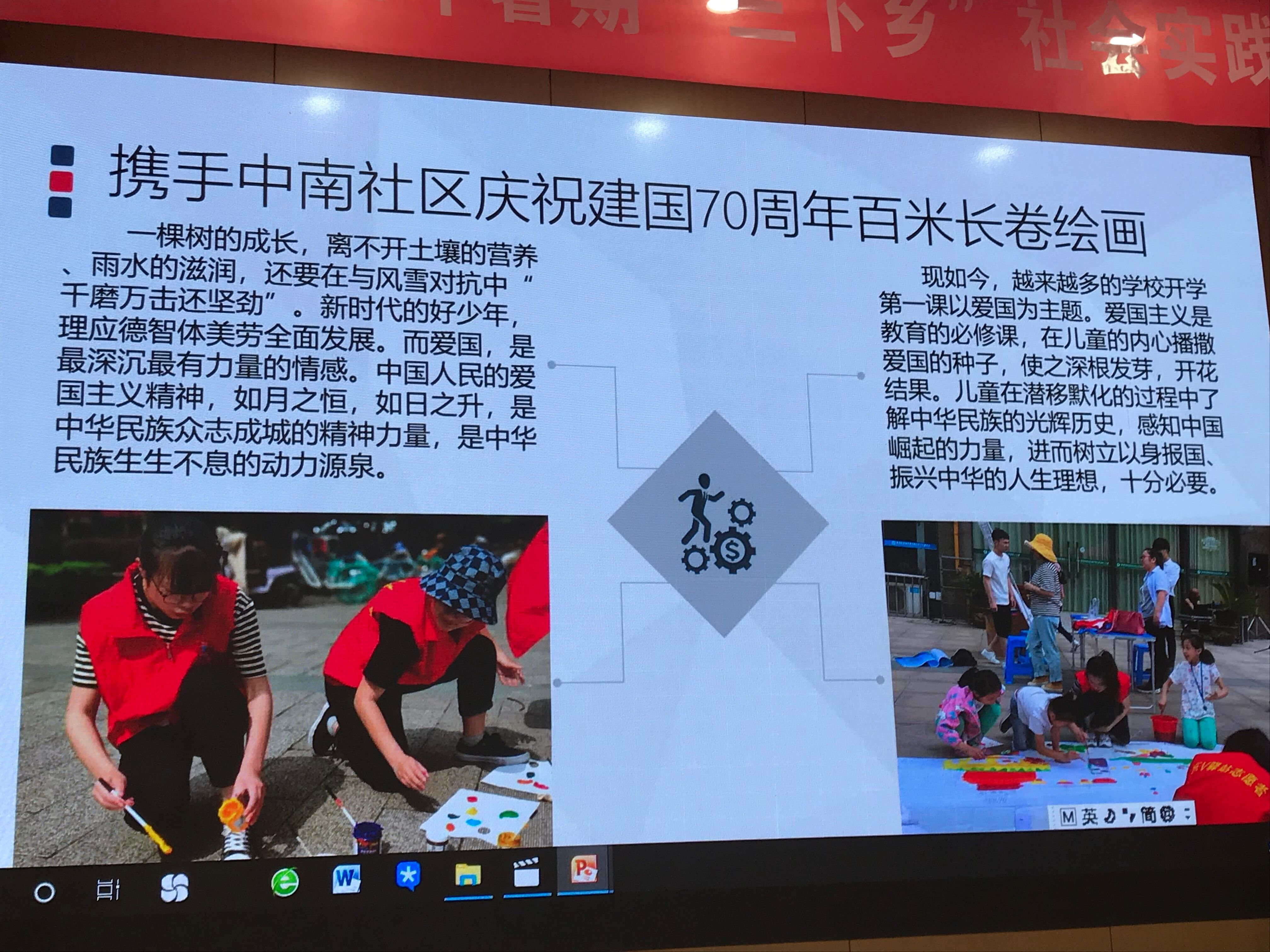 本次暑期“三下乡”社会实践活动成果展进行的第一项内容,各优秀团队轮流从活动目的、流程、意义等方面依次详细地介绍本次三下乡社会实践活动,并且以分享在活动过程中发生的小故事以及投放活动视频等方式带观众走进他们的三下乡。