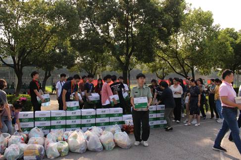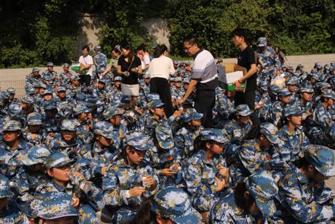 即使开学军训是每个人无法逃脱的环节,但团学组织的学长学姐们,看着新生汗流浃背的样子还是忍不住心疼。于是,会计学院学生分会、团总支和学工助理团为新生们送来了十几袋干粮和十几箱矿泉水。同时也为教官送去了一些能量饮料,感谢他们的辛苦教导。随后教官让同学们坐下来。此时会计学院学生分会与团总支开始分发干粮和矿泉水。此次分发过程中,我们保证了在场所有军训的新生都拿到了属于自己的矿泉水和干粮,看着他们满足的笑脸,每个组织者脸上都出现了满意的微笑。最后,学生分会主席陈斌进行发言,同时一位干事为新生演唱歌曲,为大一新生加油打气。