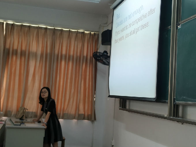 首先,许主任用日语做了简短的自我介绍。接着,她为大家讲述了学习日语的过程中可能会遇到的一些问题,以及日语系的师资力量。最后,她告诉同学们:“各种外来的资源都不及自己的努力,一定要对专业相关的书籍舍得投入。”