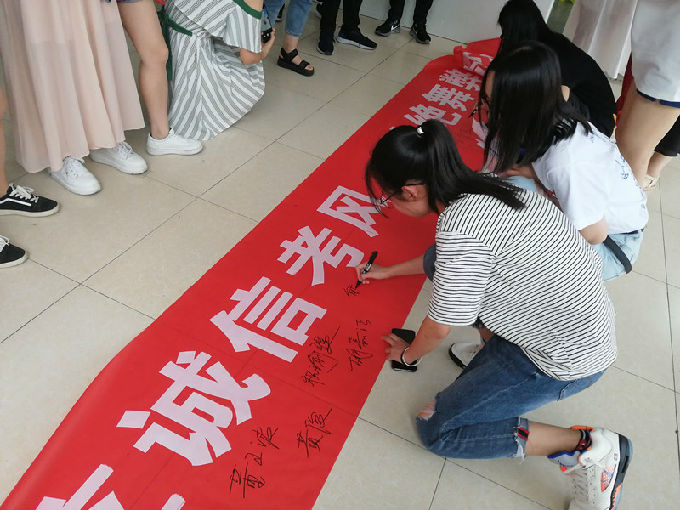 最后,主持人带领同学们在本部教学楼大厅进行了诚信应考的签字活动,同学们踊跃上前,签署自己的名字,同学们对于诚信应考的认同感非常强烈。青年大学生就应该谨遵诚信原则,以实际行动来展现当代大学生的良好风尚,树立文明考风,为建设优良校园氛围贡献自己的一份力!