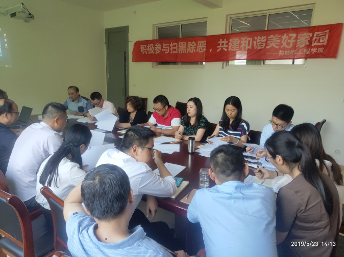 为将 “扫黑除恶”专项斗争工作无死角、全覆盖,创建平安和谐校园,5月23日下午,物联网工程学院召开扫黑除恶专项斗争专题会议。物联网工程学院院长惠晶教授、产学研院长方宁生副教授、教学院长李莎副教授、党总支副书记沈峰、各系部主任、学院秘书等17人出席此次会议。党总支副书记沈峰主持会议。