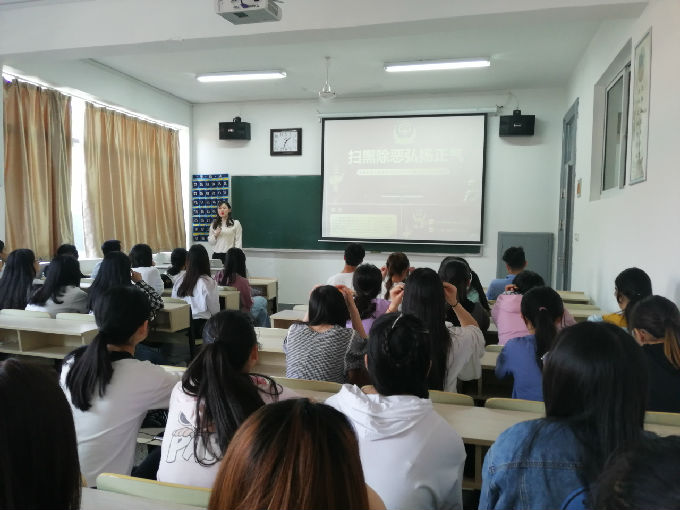 会议伊始,闵娟娟老师向大家介绍了扫黑除恶行动的开展时间和实施意义,向同学们阐述了扫黑除恶专项斗争三年的工作重点。希望全体同学统一思想认识,提高政治站位,充分认识开展 “扫黑除恶”专项斗争的重大现实意义和深远的历史意义,进一步增强抓好专项斗争的责任感和紧迫感。接下来闵老师也提到扫黑除恶专项斗争的基本原则,强调同学们要积极配合公安战线“扫黑除恶”专项斗争,将“扫黑除恶”专项斗争工作作为同学们的常态化工作,切实维护个人安全,保证同学们健康发展。