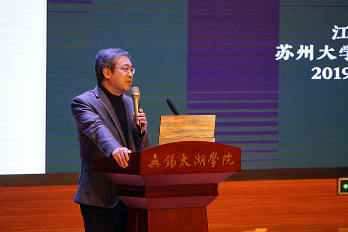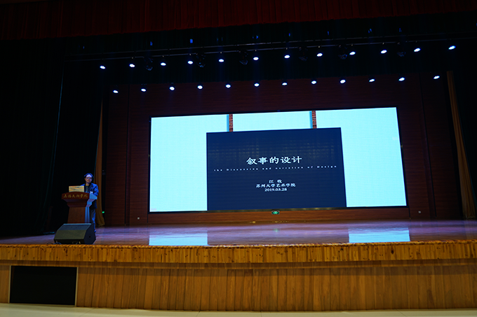 本网讯 3月28 日下午,由艺术学院主办第25讲激活设计“叙事的设计”于工科大楼报告厅成功举行。本次报告讲座邀请了清华大学美术学院博士、苏州大学艺术学院教授、博士生导师江牧教授,江教授长期从事工业设计与理论、环境艺术设计与理论、设计艺术历史与理论的研究。艺术学院副院长朱宗明、李方明、朱宁及教师代表,环艺专业学生300余人参加激活设计讲座。
