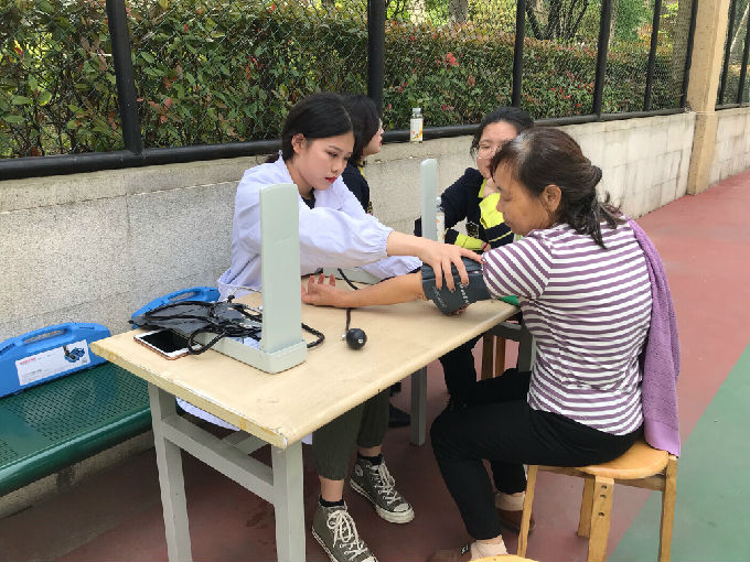 一早,志愿者们精神抖擞地来到万科社区,社区负责人带领大家来到物业中心熟悉环境,并为大家说明了注意事项。随后,社区负责人将志愿者们分为两个小组,分别在社区会议室和网球场两个地点为社区的中老年人测量血压。