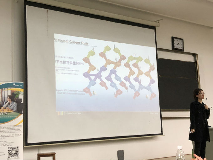 4月23日下午,外国语学院“职业与人生”大讲堂于六号楼顺利开展。本次大讲堂有幸请到苏州聚思鸿公司人事总监Tracy,参会人员包括外国语学院副院长吴旻昊、党总支副书记俞昊波、学工秘书姚靓雯及外院全体大三学生。