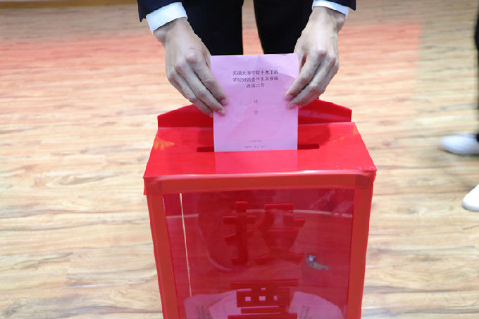 会议第七项议程,投票产生新一届土木工程学院分团委学生会委员。大会监票人员从主席团领取选票,当场向在座代表检验票箱并开箱以示代表,检验无问题后封箱,以保证投票公正透明。现场工作人员从监票人员处领取选票并分发给在座学生代表,学生代表填选完毕后依次进行投票,产生新一届土木工程学院分团委学生会委员。计票人员当场清点有效票数并如实统计选举人得票数,总监票人肖翔宣读本次大会投票选举的分团委学生会委员选举结果公正函。