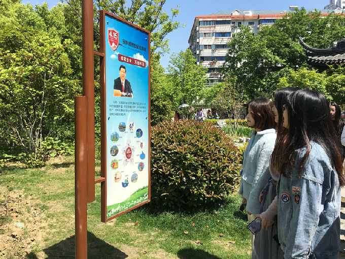 顺着蜿蜒的小路前进,路旁展示着全民国家安全教育展,同学们对此兴趣颇大,进行了阅读和浏览。再进入公园深处,是一条展示着维护国家安全的各个人物的事迹简介,上面介绍了华明之、沈安娜等人物的生平事迹,同学们之间互相交流了心得和体会,并对此次学习发表了自身的感想,更加深入地体会到了国家安全相关各领域的发展。