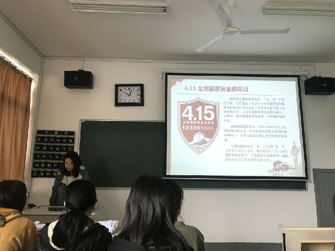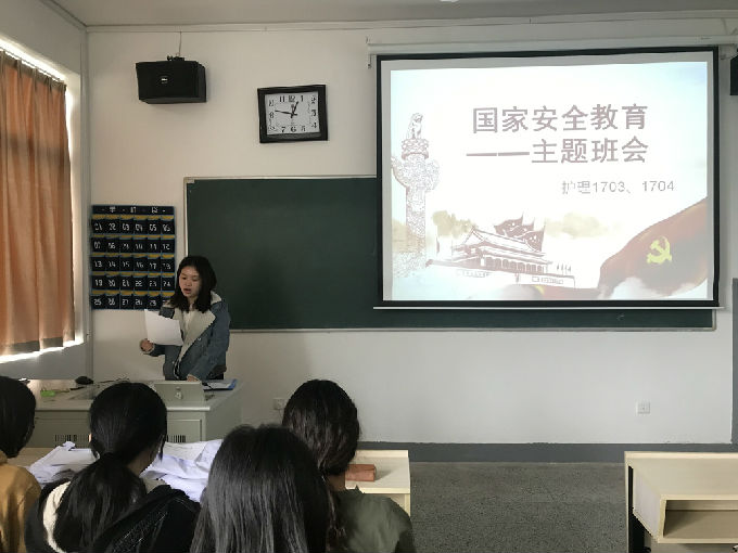 为深入学习贯彻习近平新时代中国特色社会主义思想,坚持总体国家安全观,着力防范化解重大风险,喜迎中华人民共和国70周年,全面普及学生国家安全意识和政治警觉,营造良好的自觉履行维护国家安全责任义务和教育的氛围,护理1703、1704班于4月10日在5号楼205教室开展了有关国家安全教育主题班会活动。班会由护理17级辅导员马莉主持。