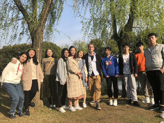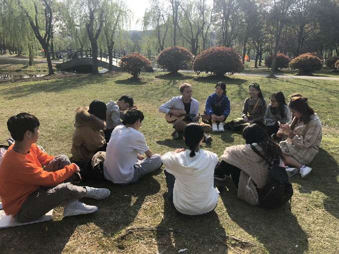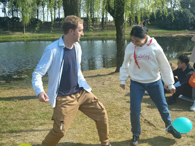 同学们与外教围坐一起,谈中英文化差异,增长见闻;亲近自然,感受大自然的美好。踏青怎能少了游戏互动环节?同学们与外教一起每人脚上绑一个气球进行游戏比拼,煞是有趣。