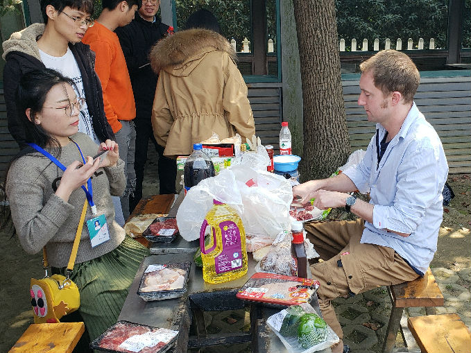 周日同学们早早起床集合,到了基地大家开始着手清洗烧烤的食材,接着再把清洗好的食材挨个穿成串。Michael给大家介绍了英国的烧烤习惯,例如在英国烧烤串上可以串上不同的食物一起烤,但在中国基本只会串同一种食材。
