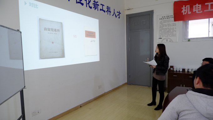 第四,16级辅导员丁苗要求当代大学生要积极向党靠拢,要有政治觉悟和符合新时代中国特色的文化素养,她通过自己的学术论文《试论阶段分析的时代性与民族性特征》,分享了自己对毛泽东思想的理解。