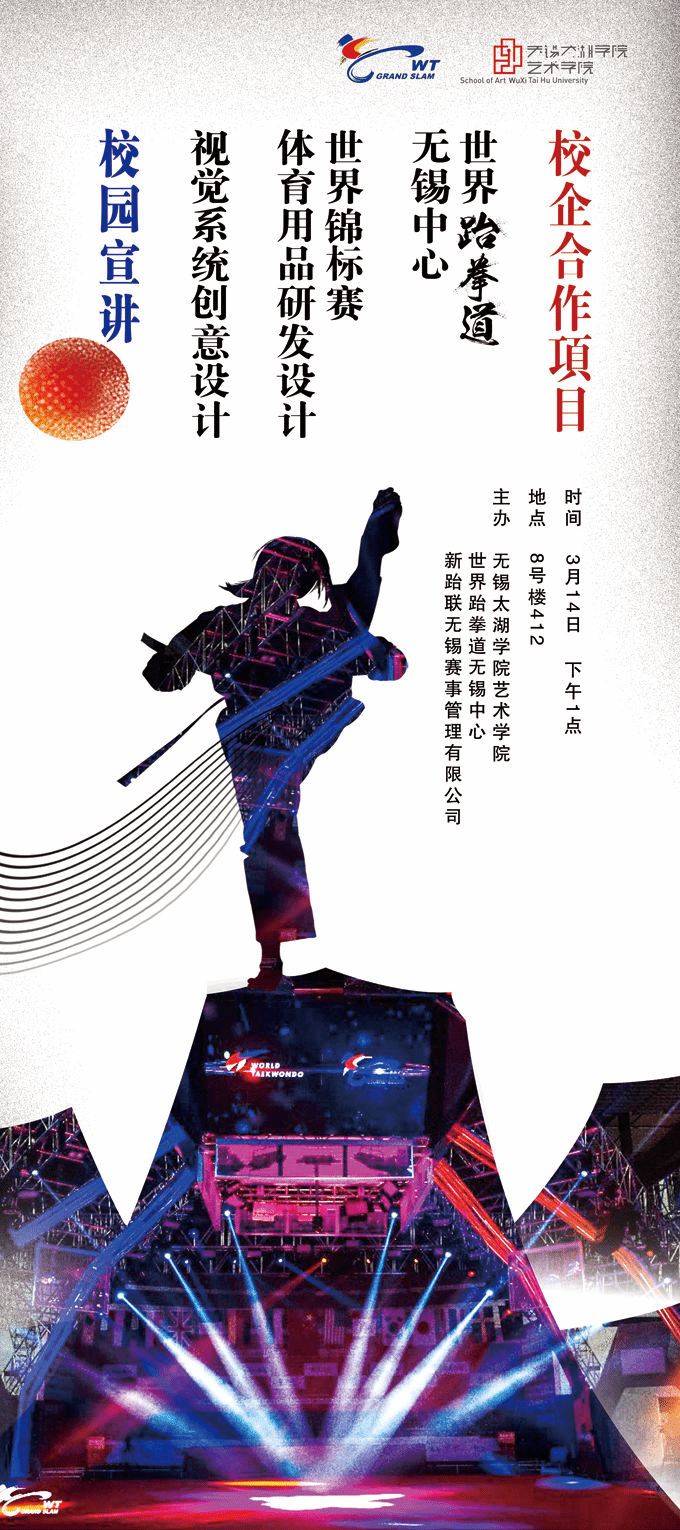 本网讯 3月14日下午一点,在8号楼412,由无锡太湖学院艺术学院、世界跆拳道无锡中心、新跆联无锡赛事管理有限公司共同主办的世界锦标赛体育用品研发设计和视觉系统创意设计校园宣讲会成功举办。