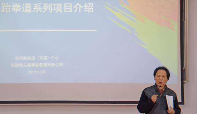 随后,世界跆拳道锦标赛无锡中心代表上台向与会师生介绍了跆拳道这一世界级赛事的现状以及在无锡今后的发展方向,并对本次宣讲会所涉及的世界锦标赛体育用品研发设计和视觉系统创意设计两大设计需求进行了详细说明。