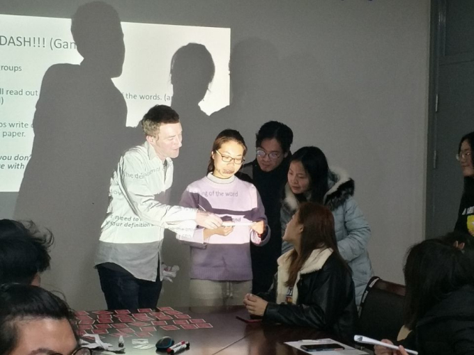 活动开始,Michael老师开始做自我介绍。工科的学生普遍英语基础较薄弱,大家都担心无法听懂。Michael老师一开口,纯正的伦敦音仿佛让大家听到了听力考试一般。他给同学们详细介绍了自己居住的地方,并展示了伦敦的美景。然后便开始了当晚的Free Talk。他鼓励同学们说出自己知道的英国食物,比如说咖喱饭,薯条等等。慢慢的,大家聊到了雅思,关于雅思考试中可能遇到的问题,Michael老师也给很好的建议。活动过程中,Michael老师会根据大家的反应,给到同学们思考的时间,让每个人尽量都能用英语来与他单独对话。在轻松愉快的气氛和Michael老师的不断鼓励下,参加这次活动的每个同学都勇敢站起来用不太流利的英语与他交流。期间外教还带同学们做了游戏,大家相互配合,真的是非常有趣。