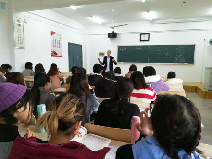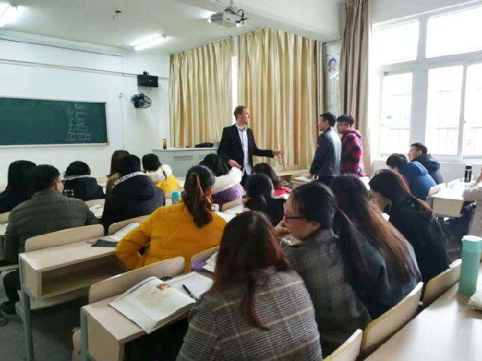 为了更好地了解外教上课的情况以及同学们在课上的具体表现,12月5日上午,国际交流与合作处处长吴导佳、副处长姚鹰走进外教Michael John Cribb的课堂,聆听了他教授的《商务英语》。