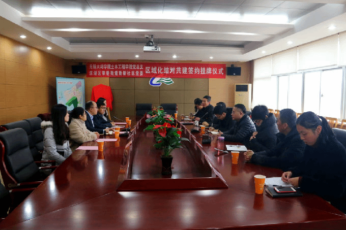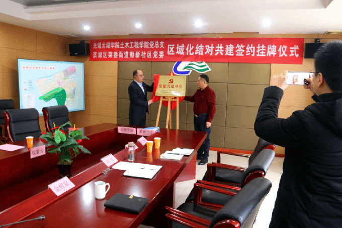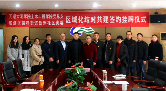 12月11日上午,无锡太湖学院土木工程学院党总支和荣巷街道勤新社区党委区域化结对共建签约揭牌仪式在勤新社区党委会议室举行。