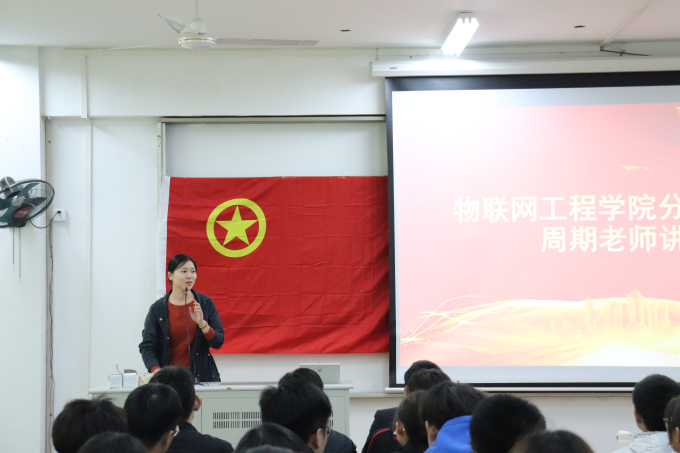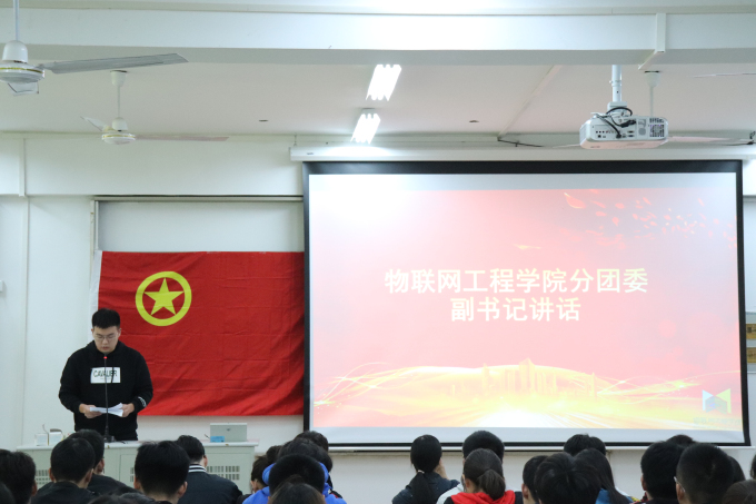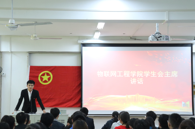 第三项议程是学生会副主席李文祥宣读《物联网工程学院分团委学生会章程》 ;第四项是学生会主席柏左政代表发言,柏左政通过往届学生会相关活动的展示,表达了对未来工作的期待,也送出了对新成员的美好祝福。第五项议程是分团委副书记虞凡华发言,介绍了分团委学生会的相关事务,同时分享了自身参加活动的心得和总结,并提出希望各部门努力提升自身实力,加强部门之间的相互协调。