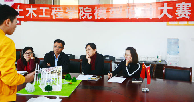 本次初赛答辩会由我院结构创新协会会长蒋军同学主持,土木工程学院副院长张军,党总支副书记余波,土木工程专业系主任贺方倩以及教研室各位老师担任此次大赛的评委。这次的建模大赛,要求每个参赛队的结构模型展示作品应能反映建筑必要的力学概念,美学概念,结构概念和创新思维,运用合理的经费支出展现自我思维理念,鼓励节能减排,循环经济的作品创新思路。此外,参赛作品的结构形式和使用材料不限。但是,为了便于展示和运输,每件结构模型的尺度限定为:最大单向尺寸不大于800毫米。