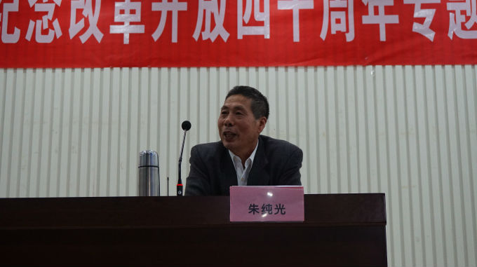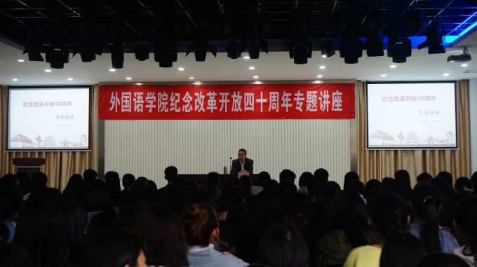 2018 年10月24日,为纪念改革开放四十周年,外国语学院有幸邀请了退休教师党支部书记朱纯光先生为大一新生和学生干部带来精彩的讲座。党总支副书记俞昊波出席讲座,讲座由分团委书记许晓艳主持。