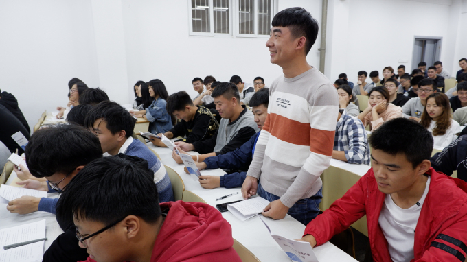 最后,佘子骞老师组织班级现场模拟学生座谈会,用抓阄的方式随机抽取同学回答可能出现的访谈问题。在校学习期间最大的收获是什么?学校伙食、生活条件如何?从“学习”到“吃住行”,引导学生客观正确的解读专家问题。伴随着同学们充满战斗力的雷鸣般的掌声,班会拉下序幕。