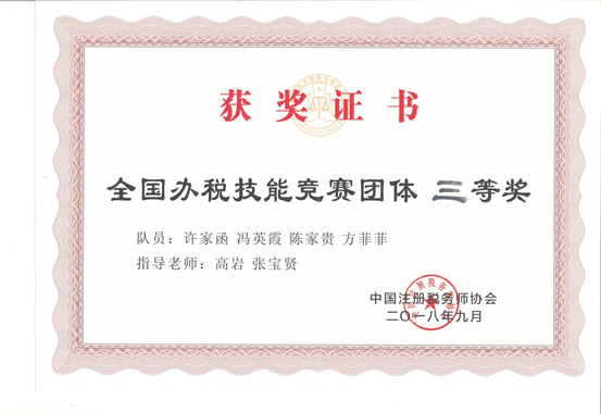 本次大赛历时3个多月,我校会计学院积极组织学生参赛,参赛学生人数超过200人,通过会计、税法、办税实务等课程、实操模块的系统学习和训练,72人取得“全国办税技能竞赛能手证书”,100余人取得“全国办税技能竞赛合格证书”,经过激烈角逐,从11万余名报名参赛选手中脱颖而出,成功杀入团体组决赛。由会计学院高岩、张宝贤两位老师带队,许佳函、陈家贵、冯英霞、方菲菲等4名大三学生组成参赛团体组,全程参加了大赛,尤其在抢答环节表现优异,获得了团体三等奖。