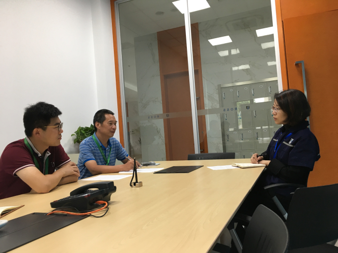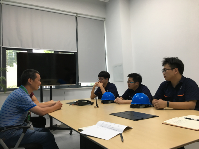 最后针对实习学生展开了座谈,钱经理详细介绍了在企实习学生的基本工作状况。各位同学都汇报了实习体会,其中,王骏梁同学目前在外勤岗位实习,主要从事图样和文案处理工作;陈朋和刘康两位同学在生产部一线岗位实习,主要从事零部件加工和装配工作。