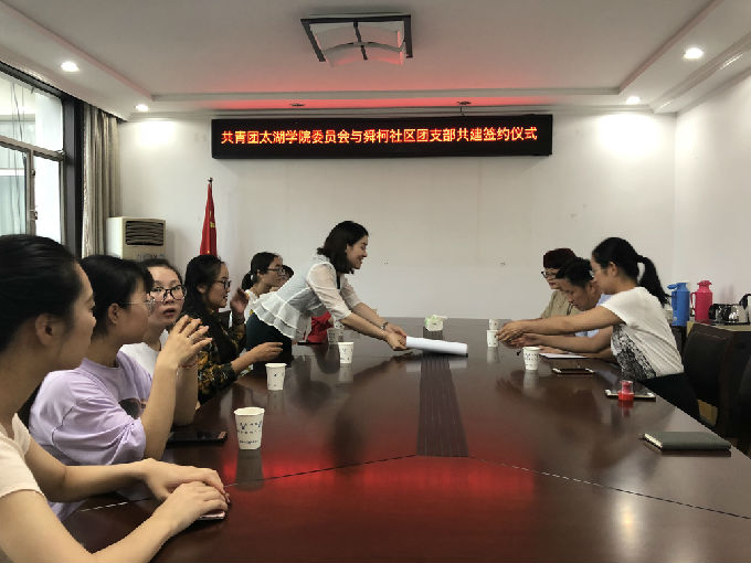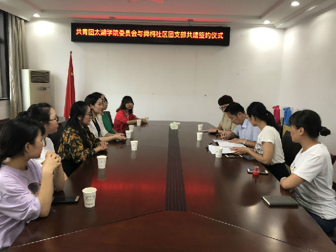 为全面贯彻党的十九大精神,以习近平新时代中国特色社会主义思想为指导,引导和帮助广大青年学生在社会中受教育,外国语学院分团委与舜柯社区团支部于2018年7月4日在舜柯社区成功签定:“共建大学生社会实践基地”协议。外国语学院副院长吴旻昊、外国语学院分团委书记许晓艳与舜柯社区党总支书记陈鹏、党总支副书记陆丹,团支部书记彭新丽参与了本次签约活动。