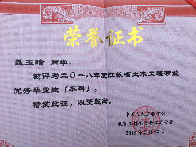 近日,从中国土木工程学会教育工作委员会江苏分会传来喜讯,我校土木工程学院聂玉晗同学被分会全体委员投票评为“2018年江苏省土木工程专业优秀毕业生”。 此奖项经江苏省各土建类高校推荐、中国土木工程学会教育工作委员会江苏分会组织专家进行评审,旨在奖励在校取得优异学习成绩和突出学术成果的土木工程专业的优秀毕业生。