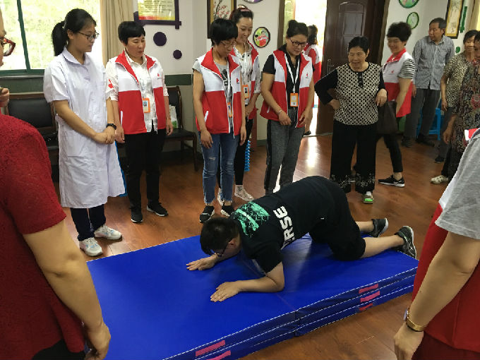 康复师首先自己做示范动作,展示如何正确摔倒,然后鼓励老人们尝试练习,红十字会志愿者从傍保护,大家从一开始的不敢练习,到后来的争先练习,有些老人经过练习已经可以完成一组正确的如何向前摔倒动作,学习能力很快,让我们为这些可爱的老人们点赞,他们真棒!