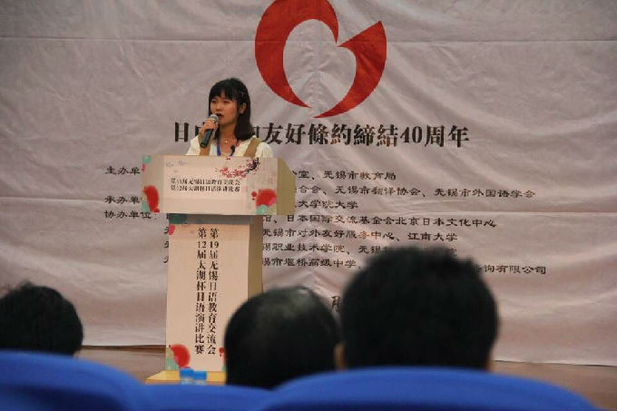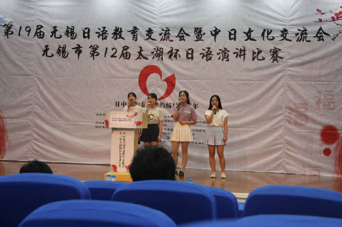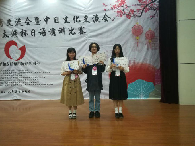 2018年5月19日我校外国语学院日语专业5名学生在日语系2位教师的带领下参加了由无锡开放大学和京都情报大学院大学共同承办的第19届无锡日语教育交流会(第12届太湖杯日语演讲比赛)。经过同学们的充分准备及教师的精心指导,日语专业2015级学生周妍璐和林慧同学获得本科组一等奖,章文军同学获得本科组二等奖,此外章文军同学还获得了全场唯一的“日本总领事特别奖”。