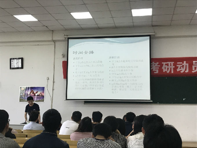动员会上,今年考取研究生的毕业生代表分别发言,分享自身考研经验和心历路程。赖聪聪学长向大家介绍了自己在考研时的不同阶段的时间安排,告诫大家要合理的安排自己的学习与生活时间,这样才能做到高效的利用时间;接着,蔡璐和翁琳瑶学姐分别分享了自己的学习方法;之后林立学长就考研后关于调剂方面的事宜向大家进行了详细的介绍。