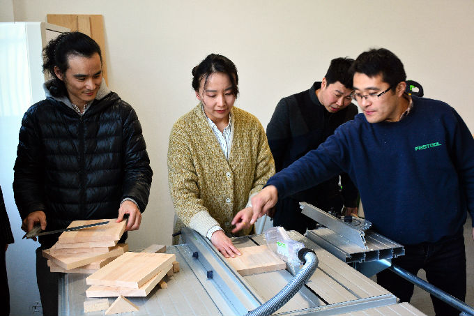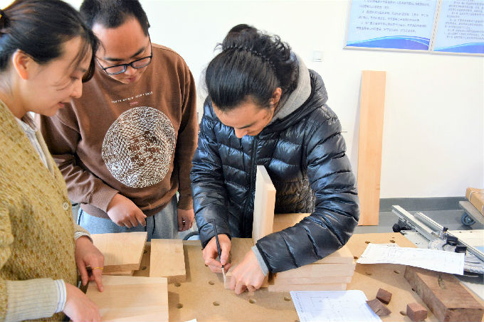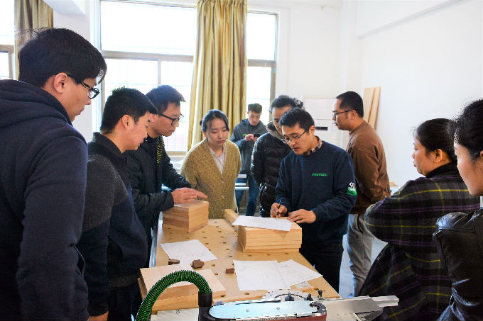 家具家居实训室采用的是德国费斯托专业木工设备,主要承担设计课程中家具设计与制作。设备方扬州汇川成套设备有限公司的两位资深技师向参加培训的教师详细地介绍和演示了设备的使用程序和规范,并且带领参加培训的教师完成了《木工基础培训小板凳》课程内容。培训分为两个阶段,培训首先进行理论上的讲解,介绍本次培训的制作图纸;第二阶段带领着参加培训的老师们动手制作了小板凳,先示范后指导,增加了老师们的实战兴趣。经过了三个多小时的培训工作,多位老师合力制作的六只小凳子新鲜出炉标志着本次培训取得了圆满成功。