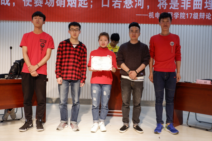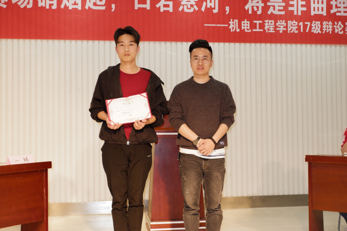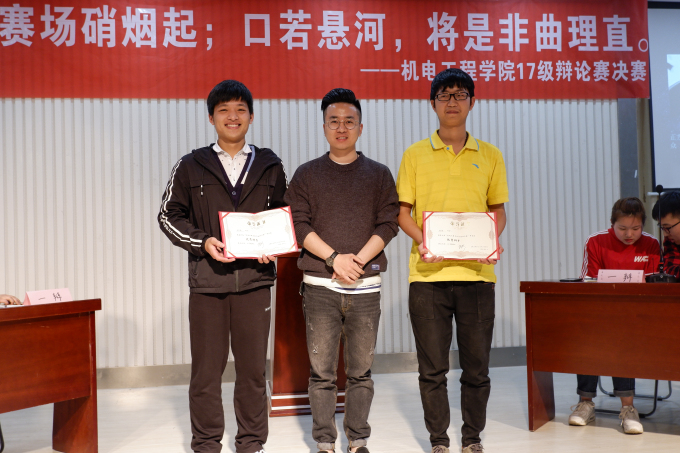 正方最后以更为清晰的论证赢得了本场辩论赛的胜利。在场观众及嘉宾对他们表示祝贺同时也感谢双方的激烈辩论给大家带来了一场精彩纷呈的视听盛宴。最后由17级辅导员佘子骞为辩论赛的胜利者—机械1702辩论队,以及“最佳辩手”、“优秀辩手”颁发荣誉证书。