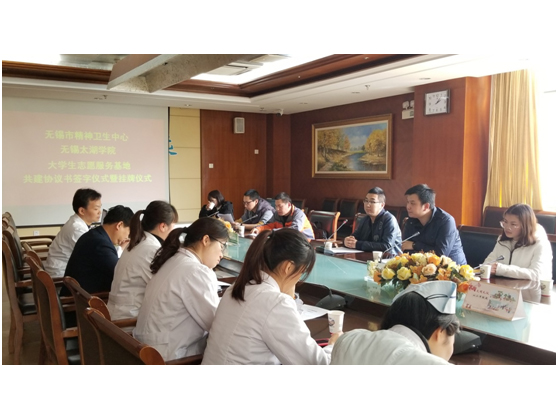 3月22日星期四下午两点,我校团委副书记陈朕、外国语学院党总支副书记俞昊波带领法学1502团支部“扶助志愿小队”的志愿者们来到无锡市精神卫生中心,在中心五楼会议室与无锡市精神卫生中心党委书记袁国桢、团委副书记计樱莹以及其他代表会面,双方将在这里进行面对面、心与心的交谈并正式签署共建大学生志愿服务基地协议并举行了挂牌仪式。