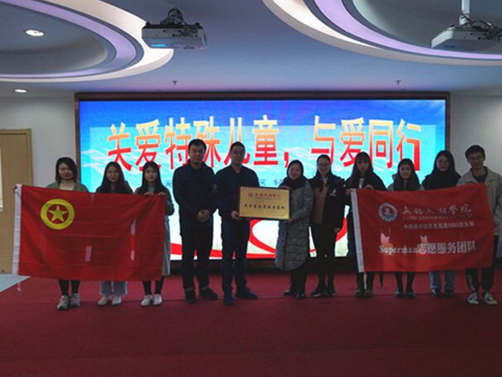 3月20日,外国语学院商务英语1603团支部“Superman”志愿服务队来到无锡市梁溪区特殊教育学校。我校团委副书记陈朕、外国语学院党总支副书记俞昊波应邀出席了挂牌仪式并签订志愿者服务基地共建协议书,随后梁溪区特殊教育学校校领导带领志愿者们一起进行参观。参观结束后志愿者们进入班级开始活动,与孩子们交流,专心观看孩子们的才艺表演。通过手工陶泥的制作,志愿者们耐心引导这些心智不够健全的孩子们。温柔地对待他们,让他们感受到志愿者们的温暖。志愿者们表示:愿这世界更温柔的对他们!