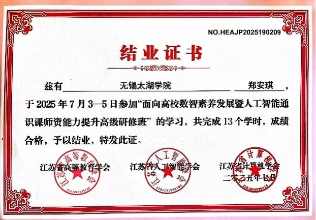无锡太湖学院一直高度重视人工智能专业建设与教师队伍的持续发展,积极鼓励教师参与各类高水平培训和学术交流活动,不断提升教学科研水平。此次郑安琪、朱嘉仪两位老师的参训,是我校紧跟教育数字化趋势、加强人工智能领域师资建设的有效举措。学校期待更多教师能将先进的教学理念和方法应用到课堂,为培养适应数智时代发展需求的高素质应用型人才贡献更多力量。