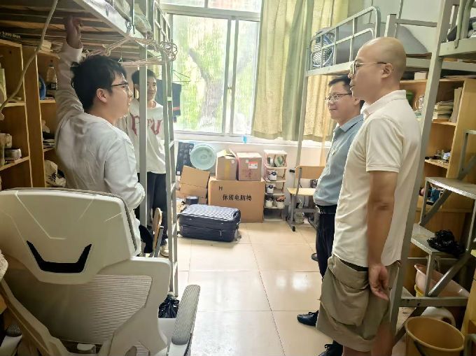 学院领导和老师们分成四组,逐一走访了学生宿舍。走访过程中,学院领导和老师们详细了解了同学们的暑假生活和新学期的规划安排,强调了宿舍安全和文明卫生的重要性,强调了防范电信诈骗的重要性,要求同学们尽快调整作息时间迎接新学期的到来。林院长和余书记在与毕业班同学们沟通交流时详细了解了他们面对即将到来的实习和就业的打算。林院长表示同学们要充分认识当前的就业形势,更加主动投身就业市场,要做好个人规划、多元化就业。