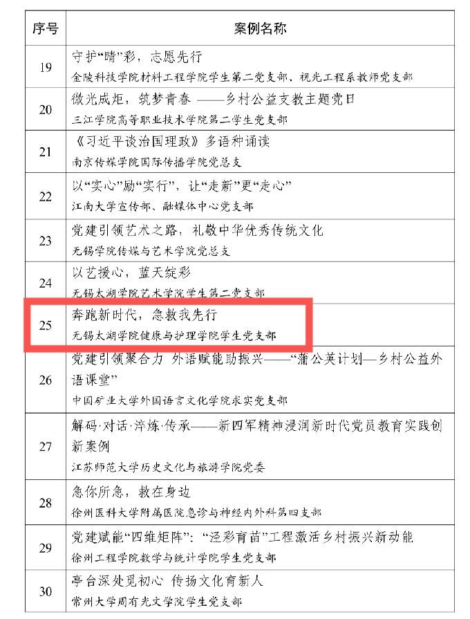 近日,中共江苏省委教育工作委员会公布了2023—2024年度江苏高校党建工作创新案例评选结果。无锡太湖学院健康医学院教师党支部和学生党支部报送的案例《构建“三阶融合、四维赋能”机制,打造新时代高素质育人先锋队》、《奔跑新时代,急救我先行》在众多申报项目中脱颖而出,成功入选江苏省高校党建工作创新案例,荣获省级表彰!