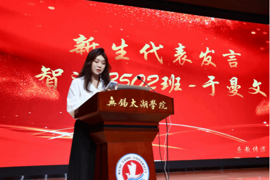 新生代表发言:智造2502班于曼文作为新生代表发言,感谢师长支持,引用"千淘万漉虽辛苦,吹尽狂沙始到金"表态:将在大学中攻克专业难关、参与实践活动,努力成为智能装备领域的追梦人。