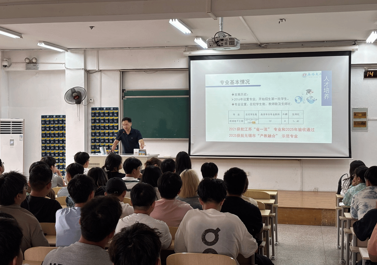 陈主任首先从宏观视角切入,系统介绍了机械电子工程的专业内涵、发展历程及行业地位,让学生对该专业有了整体性认识。随后,他介绍专业课程分布,围绕核心课程、拓展选修模块以及实验实训安排等方面,细致梳理了大学四年的课程体系,帮助学生明确学习主线。